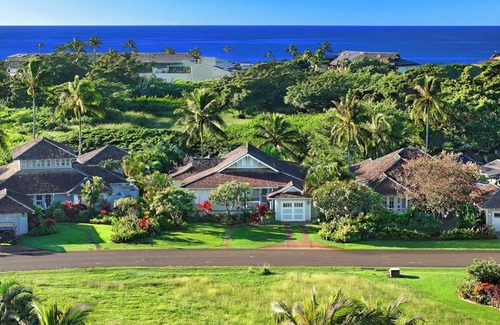 Country-cottage charm meets elevated-plantation panache in Hale Milo: this delightfully distinctive 2+BR/2.5BA home in Kukui'ula’s leafy Kaulu neighborhood. Lovely island-style details and pleasant surprises abound, from the expansive lanai overlooking a lush, colorful display of tropical foliage and magnificent trees, to the alfresco waterfall showers, to the extra-spacious full baths with their retro-chic pedestal sinks and tasteful vintage furnishings—to name a few.
