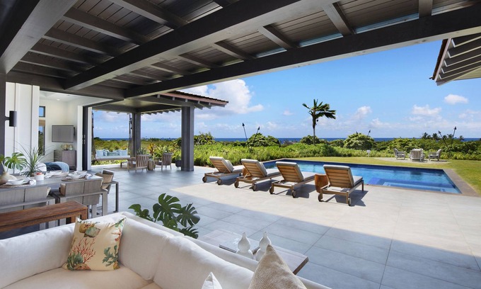 Hale Pomaika'i Mau, a stunning luxury home in Poipu, is the ideal accommodation for your wedding party, offering breathtaking ocean views and refined indoor-outdoor Hawaiian living.
