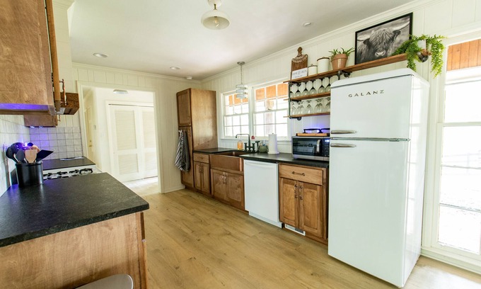 This amazing getaway is for those seeking an incredibly unique spot to unwind. If you are looking for peace and quiet while not giving up conveniences Half Moon Farm is for you. Set on almost 10 acres, this ranch style home was totally remodeled in 2023. Enter the property using an access gate with keypad. The first thing you’ll notice are the horses and miniature donkey, grazing in the pasture. They’re other farm animal buddies, cows, goats, and a barn cat; can be found out back.