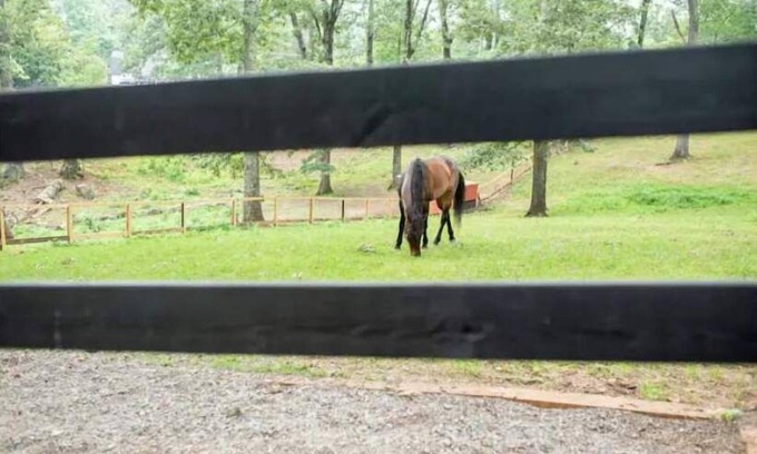 This amazing getaway is for those seeking an incredibly unique spot to unwind. If you are looking for peace and quiet while not giving up conveniences Half Moon Farm is for you. Set on almost 10 acres, this ranch style home was totally remodeled in 2023. Enter the property using an access gate with keypad. The first thing you’ll notice are the horses and miniature donkey, grazing in the pasture. They’re other farm animal buddies, cows, goats, and a barn cat; can be found out back.