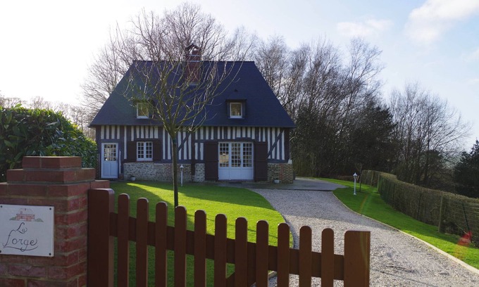 on Départementale 27 half-timbered house fully restored with sea views comfortable including upstairs 2 bedrooms one with double bed and the other 2 single beds. and on the ground floor sofa bed 2p in the living room, large fireplace with a little wood provided, bathroom, separate WC, washing machine, dishwasher (cleaning products provided) fridge / freezer TV garden furniture, barbecue garden 700 m2 fully enclosed.