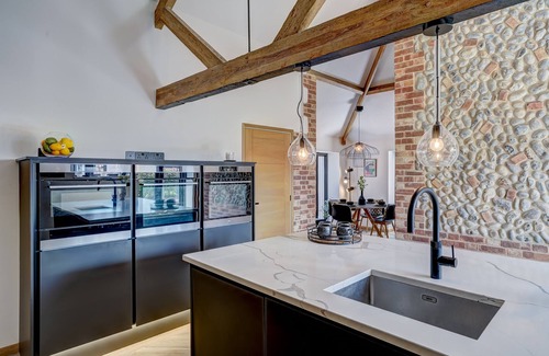 Hall Farm Barn is a brand new contemporary barn conversion in a stunning rural location. Everything is all on one level including an open plan living/dining area with a smart TV and a well equipped kitchen. For keen cooks there are two electric ovens, a large hob, microwave, plate warming drawer, integrated fridge and freezer. The kitchen island is a great focal point, and there's even a wine fridge too.