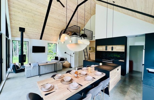 Plongez dans le charme d'un chalet style farm-house à Val Perkins, 60 min de Montreal. 8 personnes peuvent profiter de ce havre au plancher chauffant, plafond cathédrale et poutres en bois. Trois chambres et une mezzanine offrent intimité et originalité. Détendez-vous dans le spa tout en admirant la nature, sans voisins proches, à 10 min du mont Owl's Head pour le ski. Une fusion parfaite de confort moderne et d'esthétique champêtre.