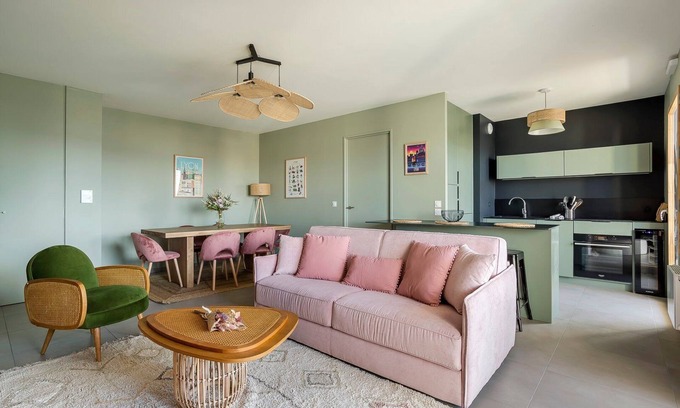 Welcome to this accommodation, composed of a bright living room with a sofa bed facing the television for your moments of relaxation, as well as a dining area with a large table and its design chairs. The fully equipped kitchen is open to the living room, as well as a bar and its high chairs. There are two separate bedrooms with double beds, each with a television for your comfort. The bathroom is modern and functional with a bathtub. The balcony has a breathtaking view of Lyon and is furnished with garden furniture, a table and high chairs!