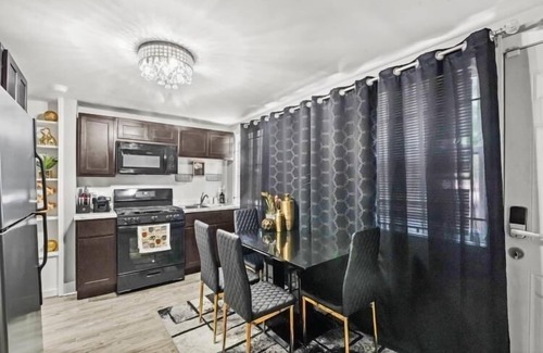 This spacious multi-level 1,300 sq. ft. townhome is the perfect blend of comfort and sophistication. Relax in the living room with smart blackout curtains, a Smart TV, elegant décor, and a high-tech smart coffee table. The kitchen is fully equipped with modern appliances: stove, microwave, refrigerator, air fryer, Keurig, electric kettle, snacks, condiments, bottled water, and all cooking essentials, perfect for guests who enjoy dining in.