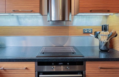 The kitchen is fully equipped with a refrigerator, microwave, oven, induction hob, dishwasher, crockery, cutlery, kitchen utensils, coffee machine, toaster, kettle, fondue set, and citrus press.