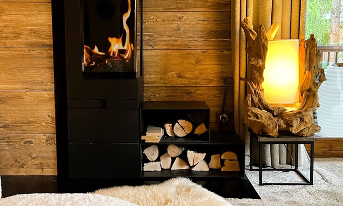 A living room with a wood-burning stove (fireplace).