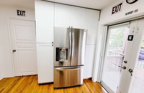 Enter the front door to hardwood floors, and a comfortable living room space. You'll definitely want to cozy up on the sofa (which folds out to a queen size bed) and watch a favorite show on the 55" flatscreen TV with cable and streaming.