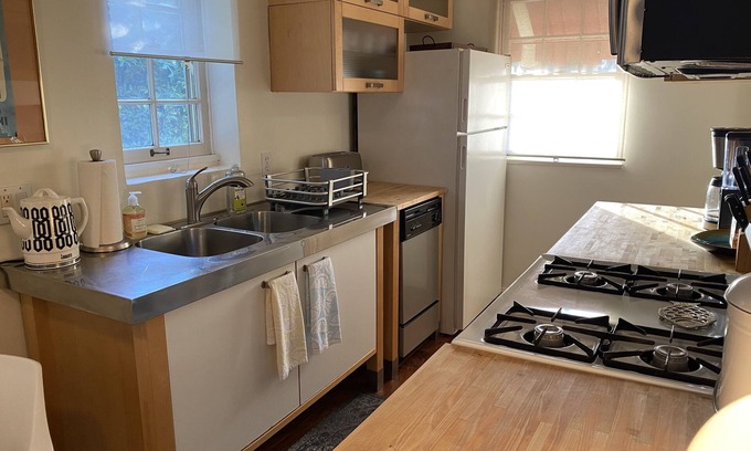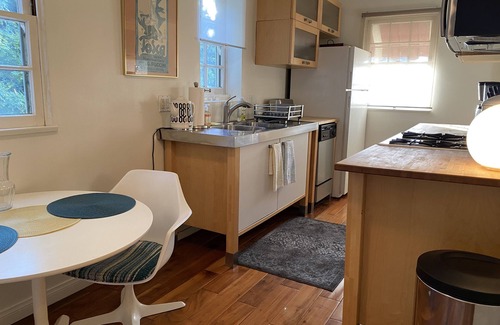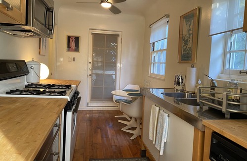 Unique, private “in-town” retreat with exclusive gated entrance to the property & apartment. Enjoy meals overlooking lush greenery or unwind on a secluded rear balcony. Beautiful 1936 Mediterranean character, beamed ceilings & modern amenities beloved by long term guests for work or rest with no shared walls. *Inquire for longer stays... In historic Hancock Park; a residential neighborhood in the center of L.A. near Larchmont, Hollywood, Paramount Studios, shops, restaurants.