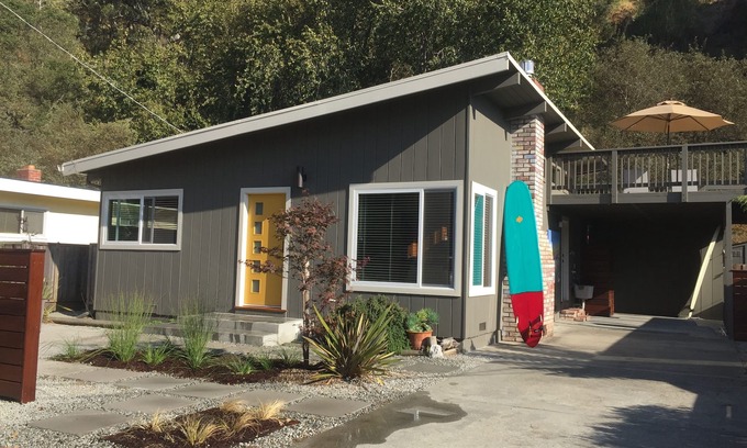 Our house is limited to 4 registered guests and rented very sparingly, and our single story "Hawaiian style" 1950's beach cottage is located on a private dead end street with a level, flat yard.... just 300 yards from the beach. Private and sunny backyard patio and sundeck with views up to tree filled open space hillside, total quiet and zen! Please read our reviews. You'll have sun, solitude, total privacy, a large backyard, sundeck, and sublime quiet in this classic/vintage, mid-century beach house, which is located on this very quiet cul de sac backing up to a Santa Cruz County Designated Scenic Corridor greenbelt in your back yard. From the backyard watch the wild-birds, seagulls, red- tailed hawks, and then listen to the owls at night. (did we say NO stairs ?!!...ours is a single story house, large level front yard and level fenced backyard, and short level walk to the sand).