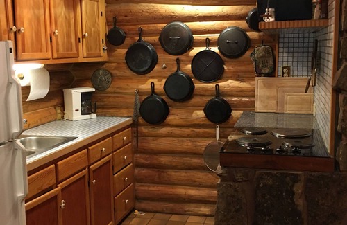 The kitchen offers a whole array of authentic Griswold frying pans and skillets, and the kitchen "gadgets" have been gleaned from antique stores all across the west; most were in use from the 1920's to the 1950's. No plastic utensils allowed!