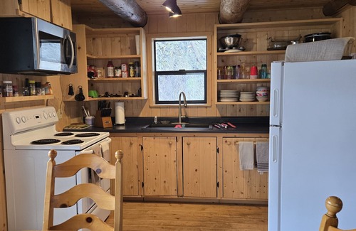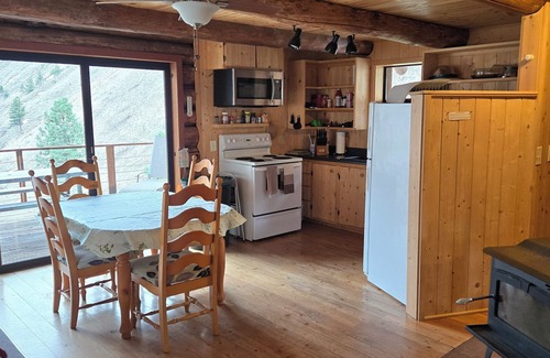 The cozy rustic Cat Creek cabin has 2 bedrooms upstairs with a Queen and single bed in the main room, the second room has a Double and single bed. The stairs are narrow and steep and not suitable for some people. The bathroom is located on the main floor, it has a shower tub and stackable washer/Dryer. The kitchen has everything you will need to prepare home cooked meals, you just need to bring the groceries. The open floor plan has a dinning area and a modest living area . No matter where you choose to sit you have a view of the majestic Salmon River canyon. The spacious deck has a propane grill , picnic table along with chairs to sit out and enjoy watching the river flow by and Bald Eagles soar. It is air conditioned for the summer months and a glass front wood stove along with electric heat for the cool months, wood can be purchased in Riggins. The cabin has a StarLink satellite system , the cabin may be isolated, but one should be able to connect to most anything, and a new smart tv is located in the living room, and WiFi calling should allow calls and texts to be made.