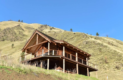 This quaint, rustic hand crafted log cabin on the Salmon River has views of the river and rugged canyon peaks that you will never forget . We are 5 miles upriver from the town of Riggins. The 24 hour sound system is provided by the big river whitewater and Cat Creek tumbling down beside the cabin. Only our guests and the owners and their families have vehicle access to a beautiful calm water swimming beach at the lower end of the property. The occasional rafter or boater have access to the mean high water line. Tie up your jet boat, drift boat or raft on the beach. You can also launch a raft or drift boat from the beach and for larger boats there are launches a mile or two down river with easy water all the way.