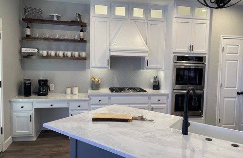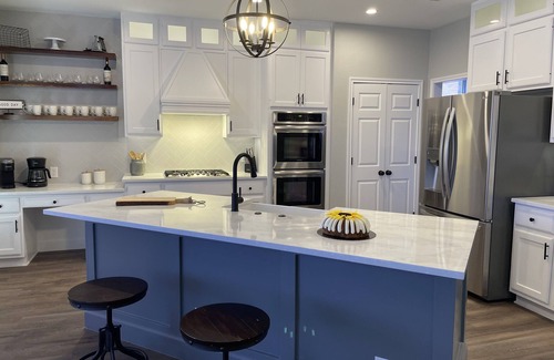 The easy flowing floor plan makes this house ideal for gathering large groups together. The plush and comfortable living room with high vaulted ceilings allows for natural light to come in a bank of windows. There is plenty of room to gather around the large screen TV to watch a game or movie on the DVD player. The kitchen is completely open with bar seating and breakfast nook. The custom built island adds extra prep and serving space with easy access to the 5-burner gas range and double oven. The kitchen also includes a microwave, crockpot, toaster, blender, drip coffeemaker and Kuerig.