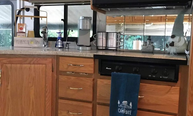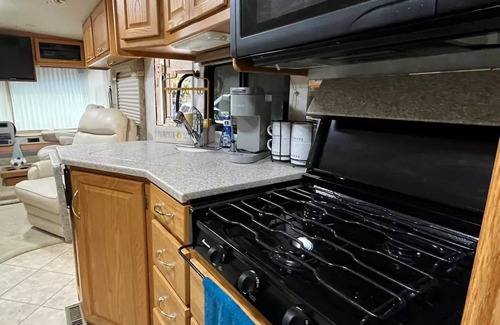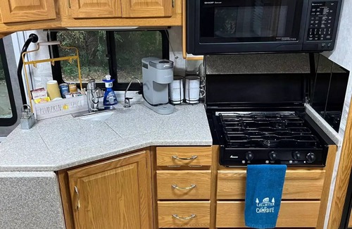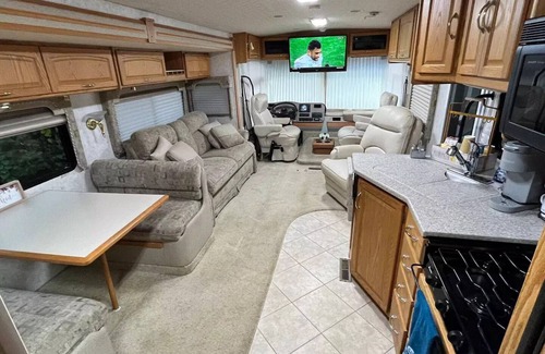 The bedroom has a queen bed with pillows and linen provided. The bathroom also has soaps and towels. The RV has full electric and water, AC runs cold. The kitchen has a propane stove top with a large tank. The living space has great leather seating and a reclining couch that doubles as the second bed. Linens, pillows and blankets are also provided for the second bed. For your viewing pleasure the RV has a 43 inch TV with streaming provided, Disney, Prime and Netflex available. Gas heat is great on cool nights and the fans will help with warm afternoons.