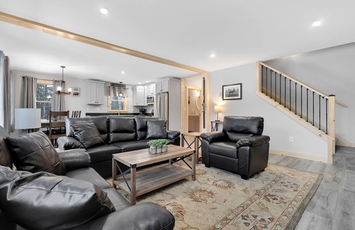Welcome to Hanover Hideaway, a brand-new 4-bedroom, 3-bathroom home located just 15 minutes from Sunday River. This stylish retreat offers an open-concept living area with a fully equipped kitchen, perfect for preparing meals and gathering after a day of outdoor adventure. Relax in the cozy living room, where an electric fireplace adds warmth and ambiance to your stay.