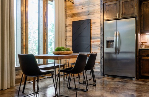 When you walk into cabin, you'll immediately notice notice the high ceilings and large windows that frame breathtaking views of the surrounding forest.
