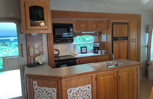 A getaway delight! This cozy 32ft camper provides the perfect scenic home away from home for an overnight stay or even a week-long vacation. Separate elevated queen bedroom provides privacy and the living room sofa pulls down to form a full bed. The spacious kitchen and functional bathroom areas are fully stocked to meet all of your accommodation needs.