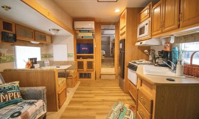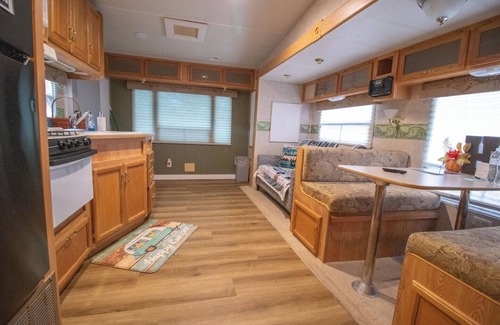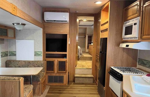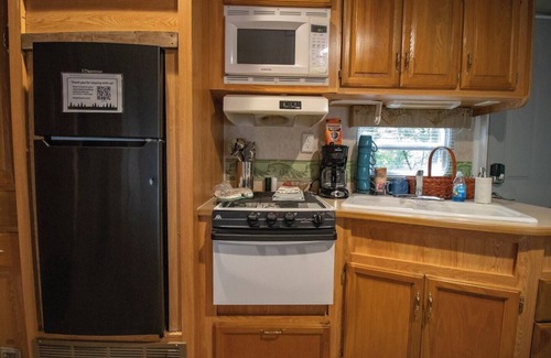 Clean and cozy with all the comforts of home! This tiny camper home has a private bedroom with a queen bed, plenty of storage and an option to convert the dining table to a single bed. The kitchen is equipped with a gas range, refrigerator, cooking and dining basics. The bathroom includes towels and basic toiletries. Heating and air conditioning make this sweet tiny home is comfortable no matter the season.