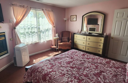 The room has 1 queen size bed and private bathroom. Must climb stairs. There is a flat screen tv, a personal fan, A/C, and fireplace. Guests enjoy clean sheets, towels and hand cloths, a hair dryer, and free toiletries. There is breakfast included every morning and a buffet bar in the Sunset House dining room with coffee, tea, water, fruit, dry cereal, and nutritional health samples for guests to enjoy.