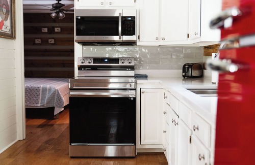 Walk across the front porch and enter your bright, large, well-lit living room with comfy furniture and a full kitchen. To the left is your cozy master suite with a comfy king-size bed - guests agree they've never had a better night's sleep! The newly renovated, modern bathroom has everything you need, and the mini-split heating and cooling makes sure you're comfy.