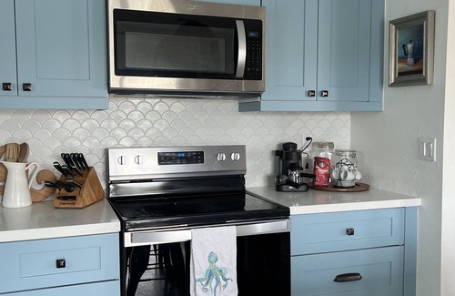 Happy Place comfortably sleeps 8 guests with 4 bedrooms, 2 full sized bathrooms and a fully equipped kitchen with everything you need to make this your home away from home. The open concept living area includes two comfy sofas and a large dining table/kitchen island that's perfect for entertaining. There are 2 spacious balconies offering open water views and ocean breezes - the balcony right outside the kitchen has a picnic table with a Weber grill ready to BBQ your freshly caught fish.