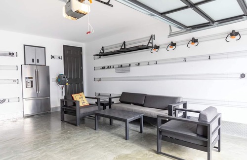 There is a large patio on the main floor, and a very spacious balcony upstairs off the bedroom with 2 beds. There are 4 bar stools at the counter, and 8 seats at the table. We never have trouble hosting our large families in this space! The garage has couches and a fridge as well as some blankets to keep you warm on the chilly nights.