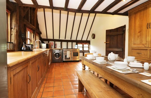 Harbourne Oast offers both a barn conversion and an accompanying annexe, situated near Tenterden in Kent. The five bedrooms in the main house are made up of a king-size with an en-suite, two further king-size rooms, a double and a twin, there is also a shower room and a cloakroom, the property is able to sleep ten guests, whereas the annexe sleeps up to three people in both a king-size bed and a sofa bed. The main house's interior also comes with a kitchen, a utility, a dining room and a sitting room with a woodburning stove, and the annexe offers a shower room and an open-plan living space with a kitchen, dining area and a sitting area. To the outside there is plenty of off-road parking and a surrounding garden with lawns and patio areas with furniture, as well as having an unfenced pond. Harbourne Oast is a charming barn conversion with a separate delight of an annexe, placed perfectly for exploring Kent. This property charges a £500 Good Housekeeping Bond.