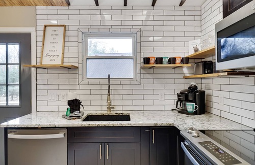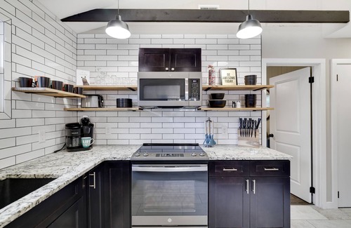 → Gourmet kitchen beaming with granite tops, Stainless Steel appliances, elegant tile backsplash and chic floating shelves.