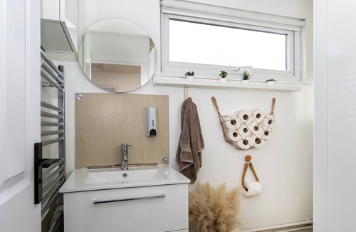 On the first floor you will find bathroom shared with other guests where you will find a spacious shower with body wash and shampoo provided in wall-mounted dispensers, anti-slip matt to prevent from slipping during the shower, a toilet, bin and washbasin. There's also one high standing shelving and one wall mounted unit which contains enough shelves for all guests to use comfortably during their stay.