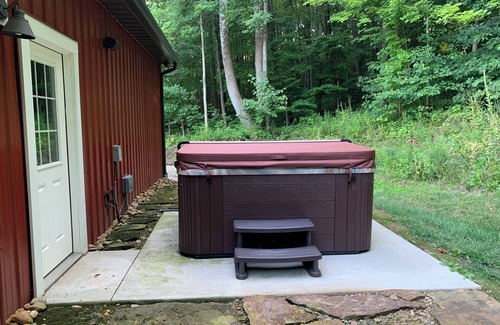 Harmony Hollows charming and cozy barndominium is picturesque both inside and out, nestled in the woods with the creek nearby. It offers a very well-maintained hot tub only a step away from the barn, a large stone ventless gas fireplace, an oversized and luxurious shower and double-vanities, fully supplied kitchen, charcoal grill, large covered porch and outdoor dining and seating areas, outdoor fire pit with provided wood, central heat/air conditioning, and free Wifi and cable TV.
