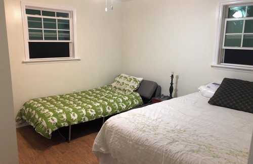 The kitchen is stocked with a keurig coffee maker, as well as an induction stove-top, microwave and mini fridge with freezer. There are two bedrooms that adjoin to one another. The bathroom has a double sink and full bath and shower. Harmony House shares one wall with the main house, but has a private entrance to the Airbnb. Guest space is 100% private. We are available, should you need us.