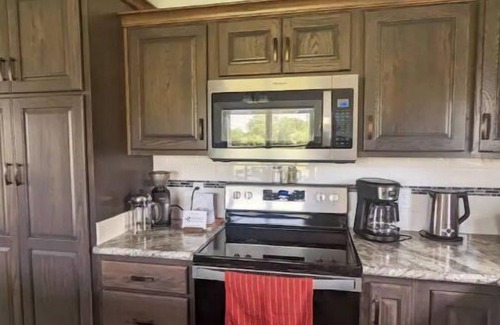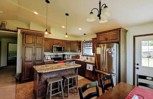 As you walk in the front door, ( with an electronic lock that we'll give you a code to) you walk into the living room with all recliner couches and lazy boy recliner, vaulted ceiling with ceiling fan. The fully furnished kitchen has a center island with bar and 2 bar stools to sit at while meals are prepared. Some of the main ingredients are also stocked. We supply the whole bean coffee, which is roasted by our son in law in Washington, where he has a roaster and his own coffee shop. There is a burr grinder and 3 ways to make coffee. A French press, an Aero press, and a drip coffee maker. We usually keep extra coffee on hand at our place if you need or want to purchase more. Off to the side is a table that seats 6. Walk out the backdoor and there is a small deck and patio with gas grill. (Barbecue tools in pantry). Down the hall there is a laundry room with washer and dryer and laundry supplies, as well as cleaning supplies in overhead cabinets. The Queen master bedroom has ceiling fan, double closet, and it's own bathroom, which has a 5' shower, and a vanity with 2 sinks. The other main floor bedroom has 2 twin beds, closet and ceiling fan. There is also a main bathroom with a tub/shower combo, and a single sink vanity.