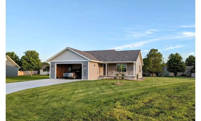 This was a completely new home in May 2021. It is a cozy home, with simple decor. On a Cul de sac on the edge of town, with open view out the front windows, big back yard, our empty lot beside it to use also.
