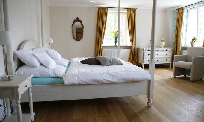 Unser Zimmer Elisabeth ist ein sehr helles Zimmer im ersten Stock an der Hausecke, sodass man sowohl in unseren Rosengarten als auch in den großen Garten zur Wiese schauen kann.