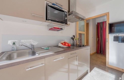 The studio is full of light thanks to large glass doors which lead out onto a private balcony. Here guests will find a café-style table and chairs where they can enjoy a glass of wine or cup of coffee with stunning mountain views. Inside, the living area has a sofa and a flat-screen TV. The dining table for 4 people is opposite the open-plan kitchen. The kitchen is equipped with a cooker hob, oven, microwave, fridge, dishwasher, a Nespresso coffee machine and fridge.