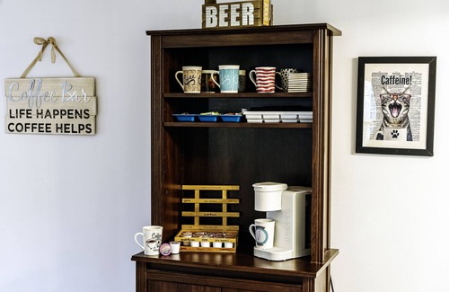 Start your morning off right at the coffee bar with complimentary assorted K-cups. The kitchen creates an ideal spot to cook a full-course meal for the entire gathering. With new modern appliances and tons of seating, at the dining table, and a high chair for kids, there is plenty of room for the entire family to enjoy.