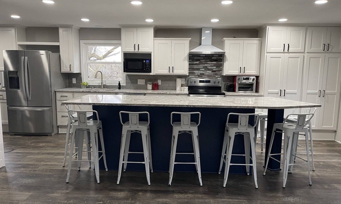 This beautiful home features five spacious bedrooms, including three king-size suites, one queen-size room, and a fun bunk room accommodating six guests. With two well-appointed bathrooms and ample entertaining space, you can comfortably host your wedding party and guests. The large kitchen boasts a quartz island with seating, two dishwashers for easy clean-up, and both gas and wood fireplaces that enhance the inviting ambiance. From the picturesque back patio perfect for cocktails to the expansive indoor living areas, you’ll find everything you need to celebrate love in style at Haven by the Lake.