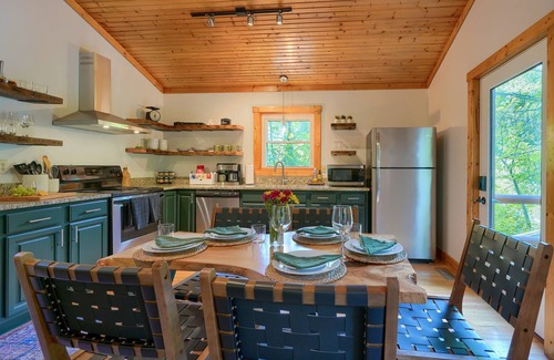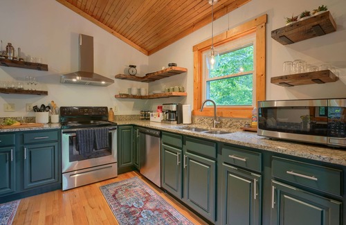 Escape to this luxurious cabin nestled among the trees. Havenwood is your perfect retreat blending comfort, style and the beauty of the outdoors. The cabin has a warm and welcoming interior featuring a bright open floorplan, polished hardwood floors, and a delightful décor that blends modern amenities with a classic cabin ambiance. It includes a spacious primary bedroom with a queen-sized bed, premium mattress, and bamboo luxury linens, and a secondary bedroom with custom built in queen bunk with XL twin bed on top perfect for 3 kids or another couple. The living space is cozy, furnished with comfortable seating, a stone fireplace, and a flat-screen TV paired with an Infinity game table—ideal for a family getaway. The kitchen is fully equipped with contemporary appliances, cookware, and both drip and Keurig coffee makers.