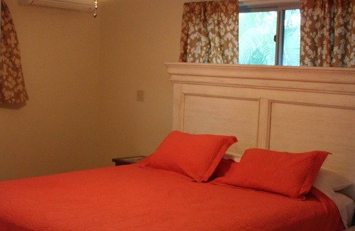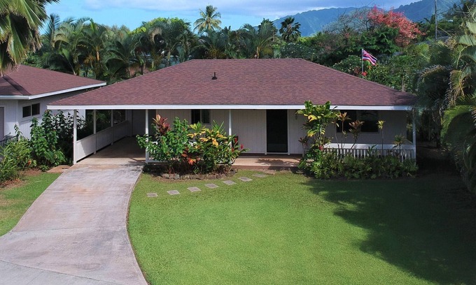 This two bedroom, one bath country cottage on Oahu’s scenic North Shore with a full kitchen and family room is perfect for any family desiring a gorgeous and secluded home base for either a relaxing or exciting tropical vacation--or both! The Ohana Country Cottage and the larger four bedroom Hauula Ohana House share a one acre private compound with beautifully landscaped lawns, tropical flowers and trees—including a small stream shaded by overhanging tree branches! There is plenty of elbow room, with green lawns for the kids to run and play on (the property is fully enclosed and gated) before or after a busy day at the beach or at the nearby Polynesian Cultural Center. Or just relax in the air-conditioned cottage watching a movie on the large screen TV, or share the island fun with emails and social media on WiFi. Close to the beach, but far from the crowds, if a comfortable, relaxing, beautiful and private Hawaiian retreat is what you need, then this is the place!