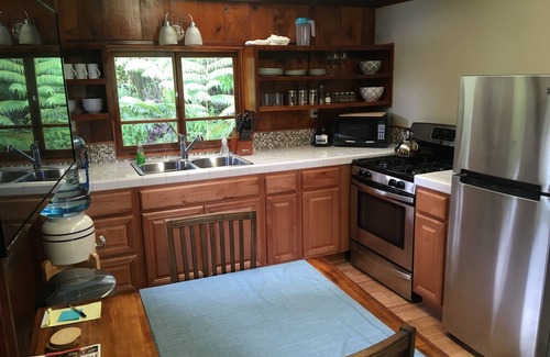 Experience the tranquility and beauty of the rainforest while enjoying modern conveniences. Create lasting memories in this unique and serene retreat. Enjoy a portable air conditioner to keep you cool and plenty of hot water for your comfort. Prepare your favorite meals with ease in our well-stocked kitchen. Centrally situated between Pahoa, Hilo and Volcano Park. View of Mauna Kea. Free snorkeling gear, beach chairs, cooler, beach towels, and umbrellas. Free fast WiFi. Complimentary Netflix