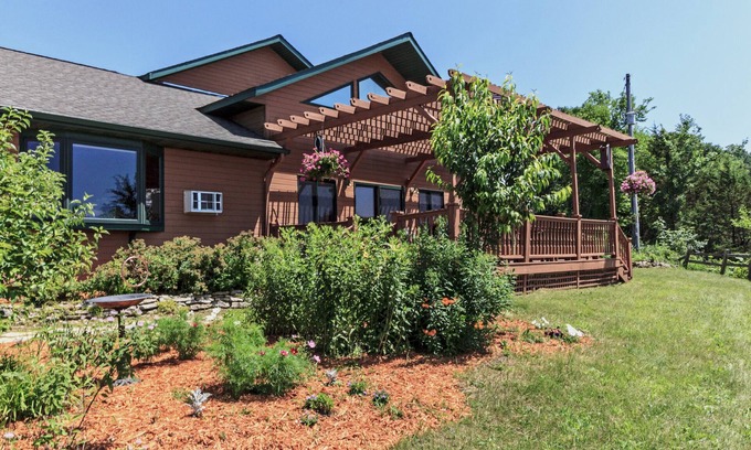 Discover serenity at Black Hawk Lodge, perched on a wooded ridge with breathtaking views. Ideal for nature enthusiasts, unwind under oak canopies with a book or explore the vineyard trail. Nearby Fountain City offers historic charm, quaint shops, and dining. Gather in the great room with a central fireplace, creating a warm and magical atmosphere. Cozy corners invite book snuggling, while deck bird feeders attract a rainbow of songbirds in this wild haven.