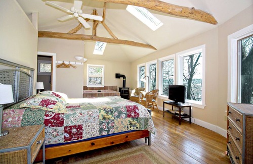 This is our highest cottage on the bluff, with approximately 120 steps to the front door. It is a 2-story cottage, with the bedroom upstairs, and the kitchen/living area on the main level. The bedroom features a whirlpool bathtub, gas fire place, a main bathroom, including shower, deck and gas grill. There is an air conditioner on the upstairs level. A T.V. and Roku device for your viewing pleasure. The main level consists of a dining area, kitchen, living area, gas fireplace, as well as a powder room. It also has a futon, if an extra bed is needed. The kitchen comes completely furnished, including breakfast items for you to make, if you wish.