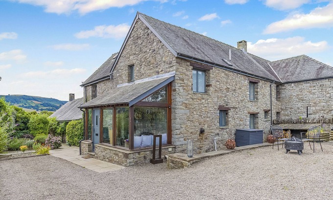 Bedroom 4: Double (4ft 6in) Bed, Child Single Bed. Oil central heating, gas, electricity, bed linen, towels, Wi-Fi and fuel for wood burner included. Travel cot, highchair and stairgate. Welcome pack. Enclosed back garden with sitting-out area, terrace, garden furniture and gas barbecue. Wood-fired hot tub for 6 (private). Private parking for 5 cars. No smoking.. Hay Boathouse/Maes-y-Caer is a beautifully appointed barn conversion just a short walk from the bustling book town of Hay-on-Wye, perfect for families and groups seeking a peaceful, yet well-connected rural escape. The spacious interior blends rustic charm with modern comforts.