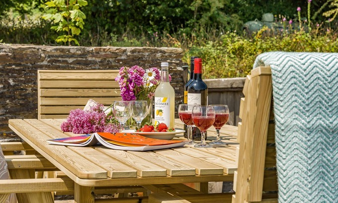 Upstairs, you will find the three cosy bedrooms, a double room inclusive of a Juliet balcony with stunning views of the farmland, and two twins bedrooms. There is a cloakroom on the first floor for ease, and a sitting room with a wood burning stove and french doors opening out to the garden terrace. Soak up the tranquil Devon countryside on the paved patio area, during the summer months, or gather around the firepit in the evenings with a spot of stargazing in this rural location.