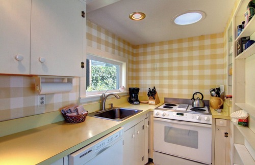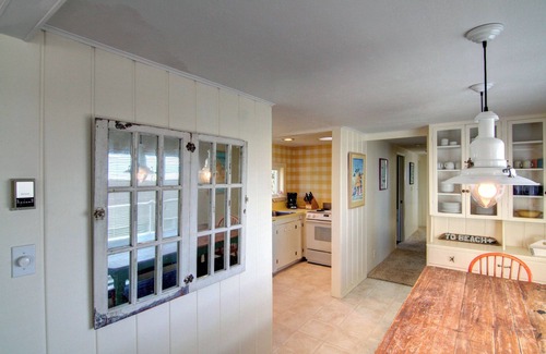Surrounded by nautical decor and beach-y comforts, views from every room draw you into the perfect beach-cottage experience. The front entry invites you into the open dining area, the nostalgic farm table awaits diners eager to watch the sea with their breakfast meal and cup of coffee. In the snug, cheery kitchen just to the side of the dining area, the view is still just a glance away.