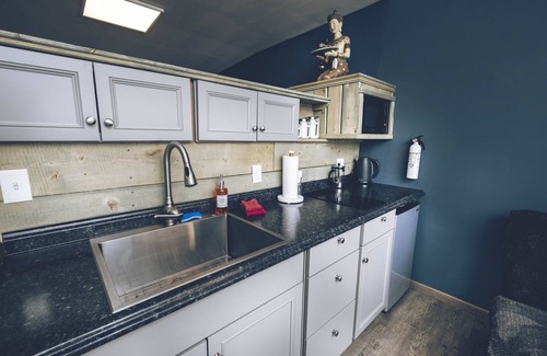 Comfy queen bed, kitchenette w/ basic tableware, pots n’ pans. This room has a coffee maker with organic coffee & sugar. We also provide creamer and tea. TV with Roku (Netflix provided) Organic shampoo, conditioner and body wash & hair dryer. Quiet, yet in town.