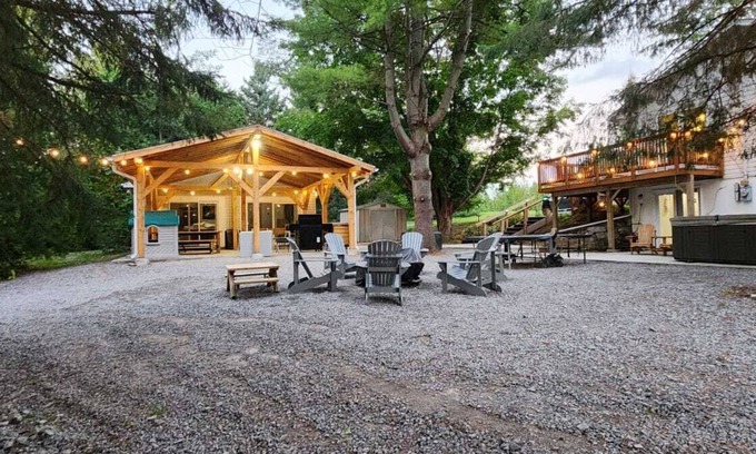 1.5HRS From Toronto, waterfront access to 2 lakes from dock (Head lake and Rush Lake) . Fully renovated, central heat and ac, lots of parking, fishing off dock, large grassy 3 acre lot with trees surrounding property for privacy, LOTS OF ACTIVITIES, Barrel Sauna, hottub, volleyball, billards and more.