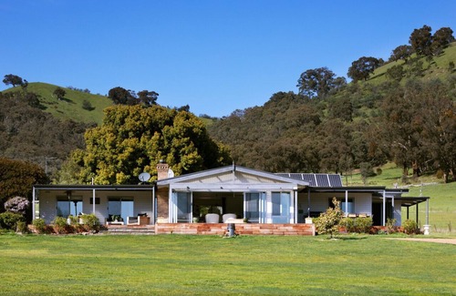 Headley Homestead features five elegantly appointed bedrooms, accommodating up to 13 guests. Enjoy the luxury of a master suite with an ensuite, alongside two Queen bedrooms, a double bunk room, and another with twin bunks—ideal for your loved ones. The open-plan living space includes a cozy kitchen and lounge area complete with an inviting wood fire. Step outside to discover two distinct entertaining areas on the undercover deck, complete with BBQ facilities and outdoor dining overlooking the serene pool. Engage in fun activities such as table tennis or cozy up around the large fire pit, all while surrounded by stunning views of rolling hills and vibrant wildlife.