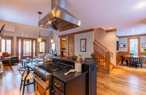 First floor offers an open floor plan with superb gourmet kitchen, stainless steel Viking appliances, Keurig, eat in area and a living room with two-story stone gas-log fireplace and Roku TV. The bedroom suite on the main level offers king size bed with French doors to the wrap around deck and private Roku TV. The attached, private bath features walk-in tile shower and wave therapy tub.